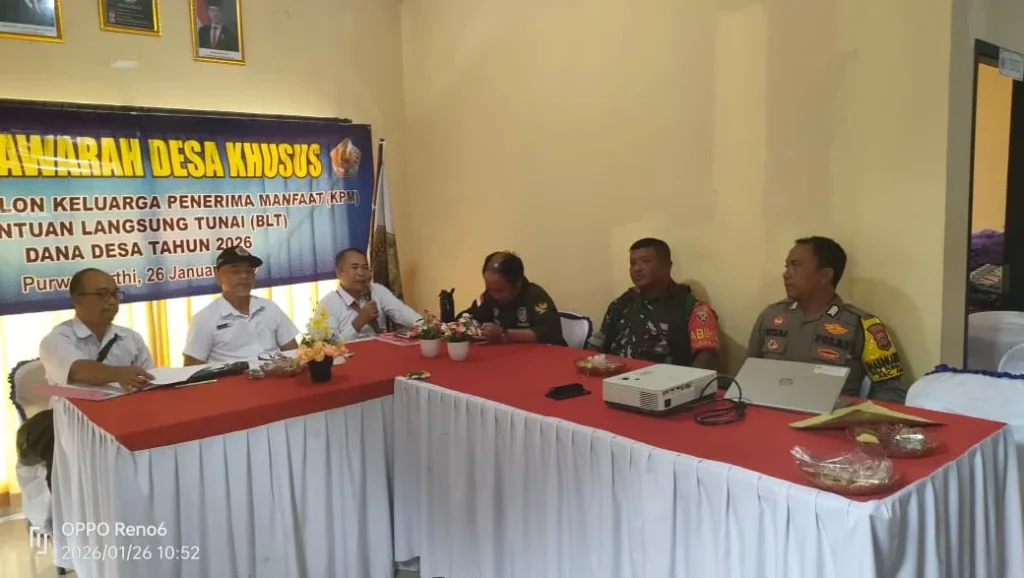 Pemerintah Desa Purwa Kerthi telah melaksanakan Musyawarah Desa Khusus (Musdesus) Penetapan Keluarga Penerima Manfaat (KPM) Bantuan Langsung Tunai (BLT) Dana Desa Tahun 2026 pada tanggal 26 Januari 2026. Kegiatan ini bertempat di Aula Kantor Desa Purwa Kerthi sebagai forum resmi penetapan penerima bantuan sesuai ketentuan yang berlaku.